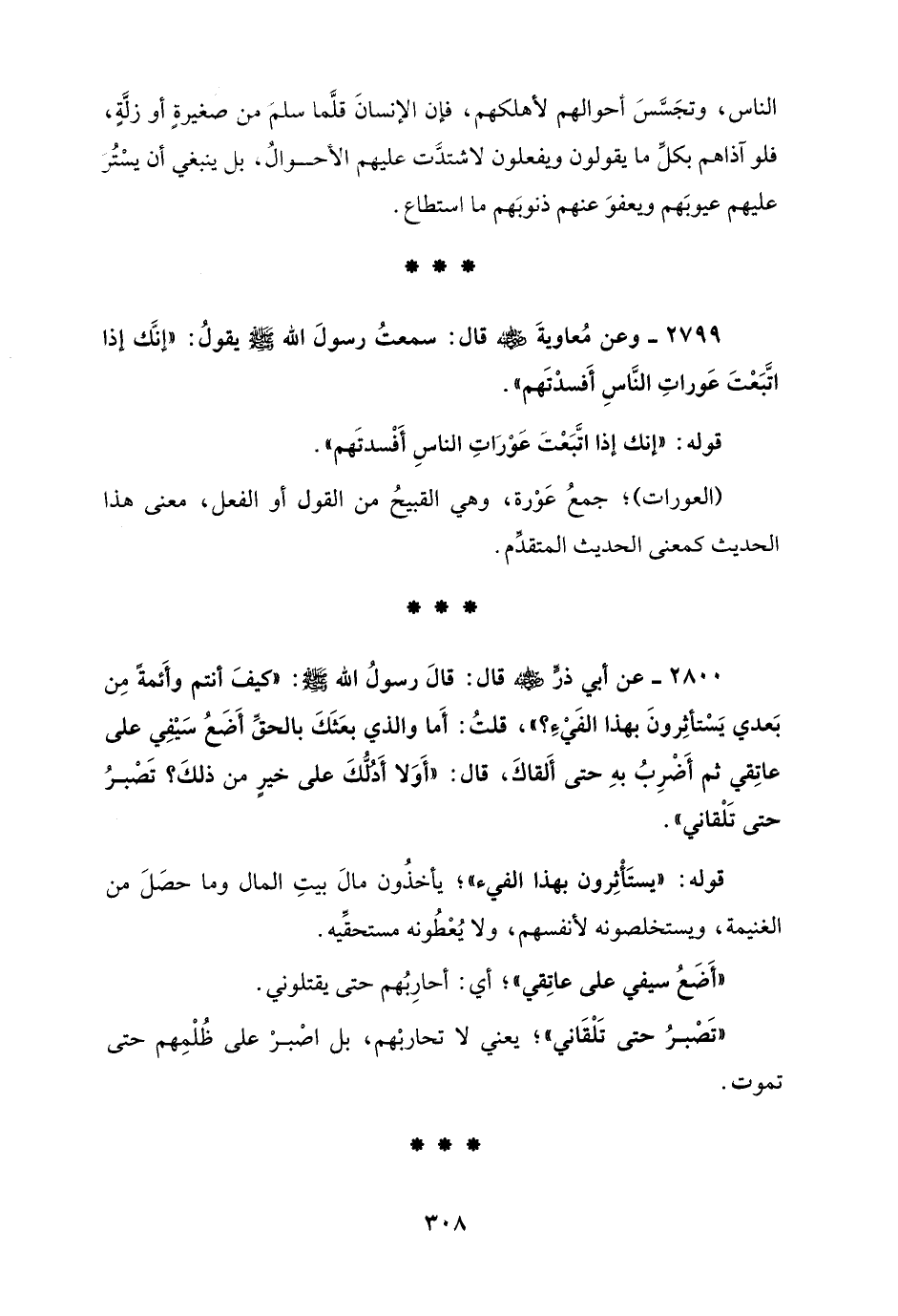 2799 - وعن مُعاويةَ - رضي الله عنه - قال: سمعتُ رسولَ الله - صلى الله عليه وسلم - يقولُ: "إنَّك إذا اتَّبَعْتَ عَوراتِ النَّاسِ أَفسدْتَهم".