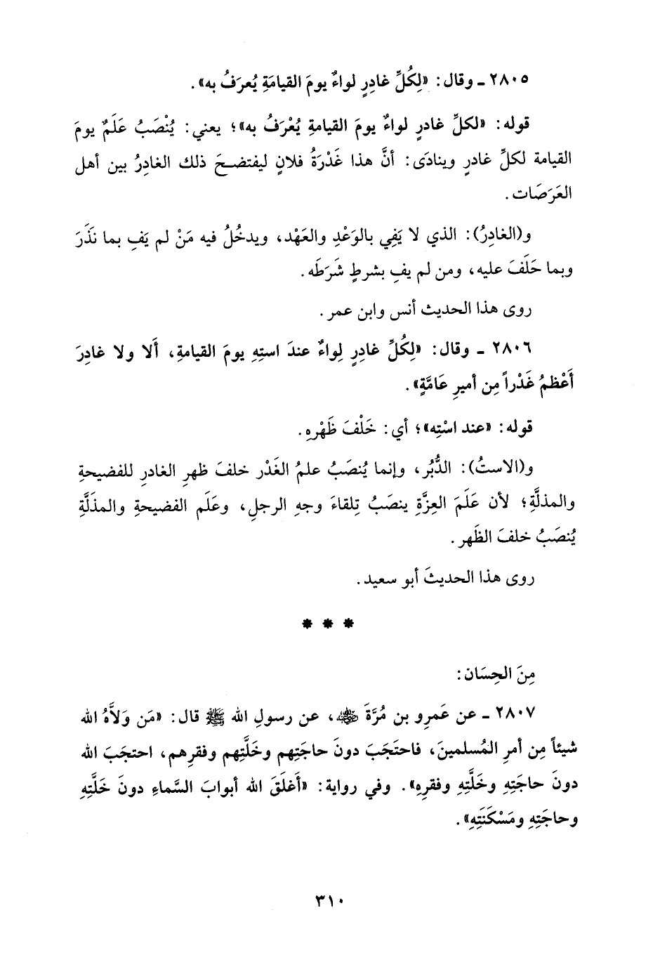 2806 - وقال: "لِكُلِّ غادِرٍ لِواءٌ عندَ استِهِ يومَ القيامةِ، أَلا ولا غادِرَ أَعْظمُ غَدْرًا مِن أميرِ عَامَّةٍ".