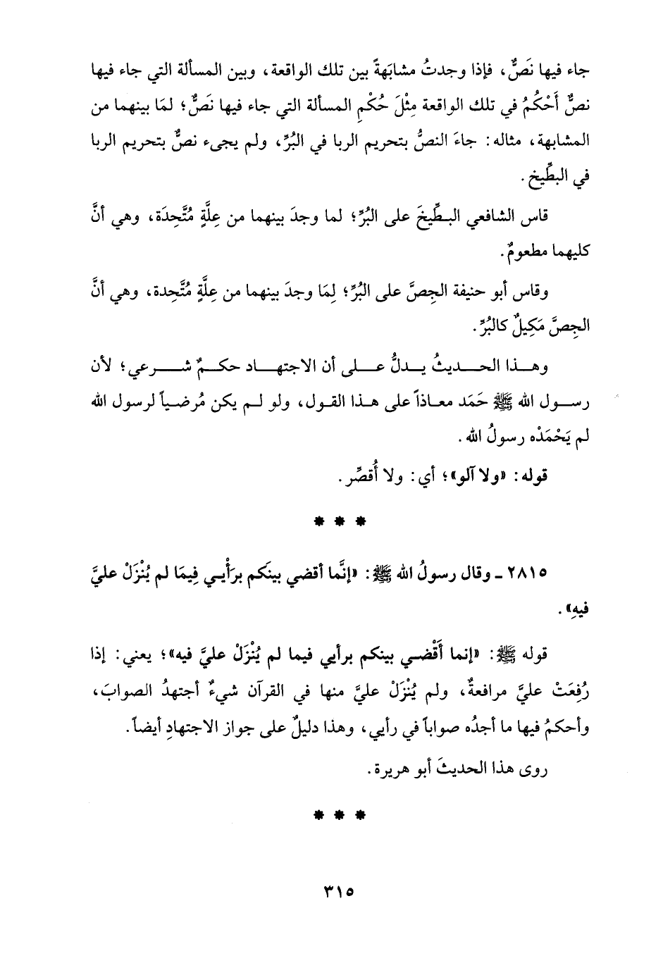 جاء فيها نَصٌّ، فإذا وجدتُ مشابَهةً بين تلك الواقعة، وبين المسألة التي جاء فيها نصٌّ أَحْكُمُ في تلك الواقعة مِثْلَ حُكْمِ المسألة التي جاء فيها نَصٌّ؛ لمَا بينهما من المشابهة، مثاله: جاءَ النصُّ بتحريم الربا في البُرِّ، ولم يجئ نصٌّ بتحريم الربا في البطِّيخ.