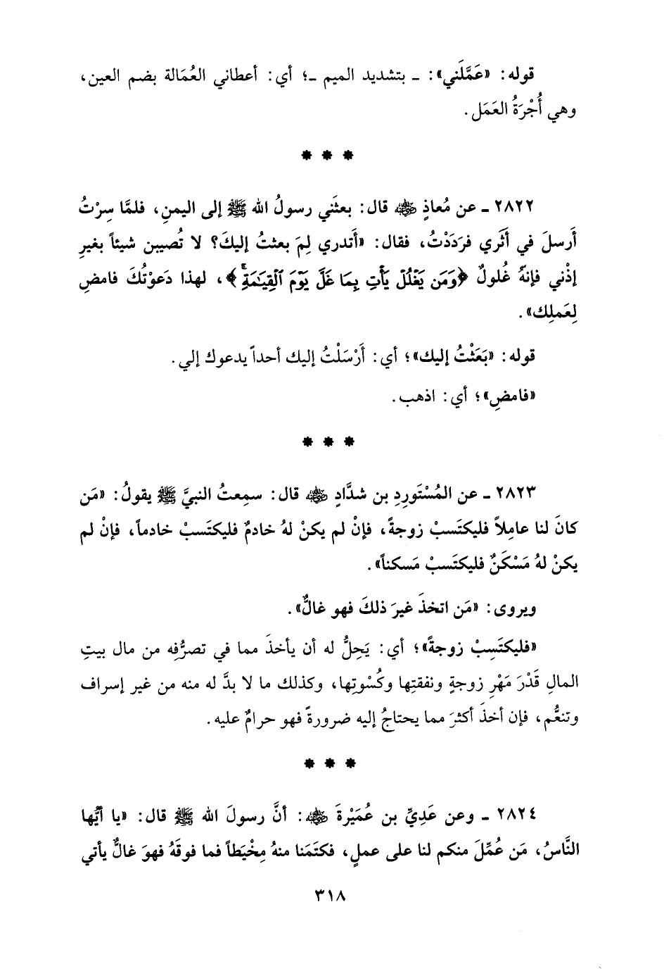 2822 - عن مُعاذٍ - رضي الله عنه - قال: بعثَني رسولُ الله - صلى الله عليه وسلم - إلى اليمنِ، فلمَّا سِرْتُ أَرسلَ في أَثَري فرَدَدْتُ، فقال: "أَتدري لِمَ بعثتُ إليكَ؟ لا تُصيبن شيئًا بغيرِ إذْني فإنّهُ غَلولٌ {وَمَنْ يَغْلُلْ يَأْتِ بِمَا غَلَّ يَوْمَ الْقِيَامَةِ}، لهذا دَعوْتُكَ فامضِ لِعَملِك".