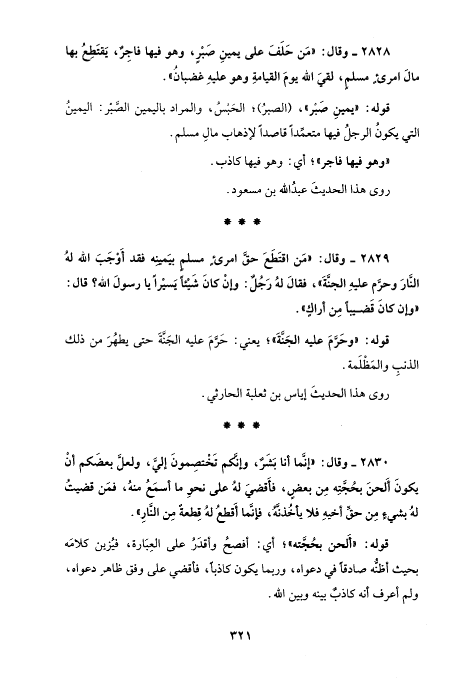 2828 - وقال: "مَن حَلَفَ على يمينِ صَبْرٍ، وهو فيها فاجِرٌ، يَقتَطِعُ بها مالَ امرئٍ مسلمٍ، لقيَ الله يومَ القيامةِ وهو عليهِ غضبانُ".