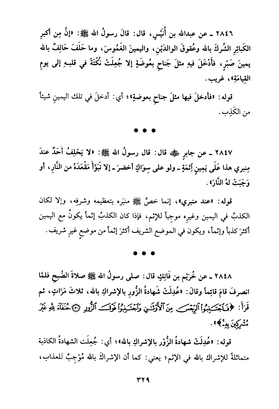2848 - عن خُرَيْم بن فَاتِكٍ قال: صلى رسولُ الله - صلى الله عليه وسلم - صلاةَ الصُّبح فلمَّا انصرفَ قامَ قائِمًا وقالَ: "عُدِلَتْ شَهادةُ الزُّورِ بالإشراكِ بالله، ثلاثَ مَرَّاتٍ، ثم قَرَأَ: {فَاجْتَنِبُوا الرِّجْسَ مِنَ الْأَوْثَانِ وَاجْتَنِبُوا قَوْلَ الزُّورِ (30) حُنَفَاءَ لِلَّهِ غَيْرَ مُشْرِكِينَ بِهِ} ".