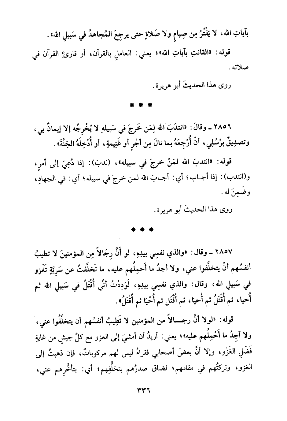 2857 - وقال: "والذي نفسِي بيدِهِ، لو أَنَّ رِجَالاً مِن المؤمنينَ لا تطيبُ أنفسُهم أنْ يتخلَّفوا عني، ولا أجدُ ما أَحمِلُهم عليه، ما تَخلَّفتُ عن سَرِيَّةٍ تَغْزو في سَبيلِ الله، وقال: والذي نفسِي بيدِهِ، لَوَدِدْتُ أنيِّ أُقْتَلُ في سَبيلِ الله ثم أُحيا، ثم أُقْتَلُ ثم أُحيَا، ثم أُقْتَل ثم أُحْيَا ثم أُقْتَلُ".