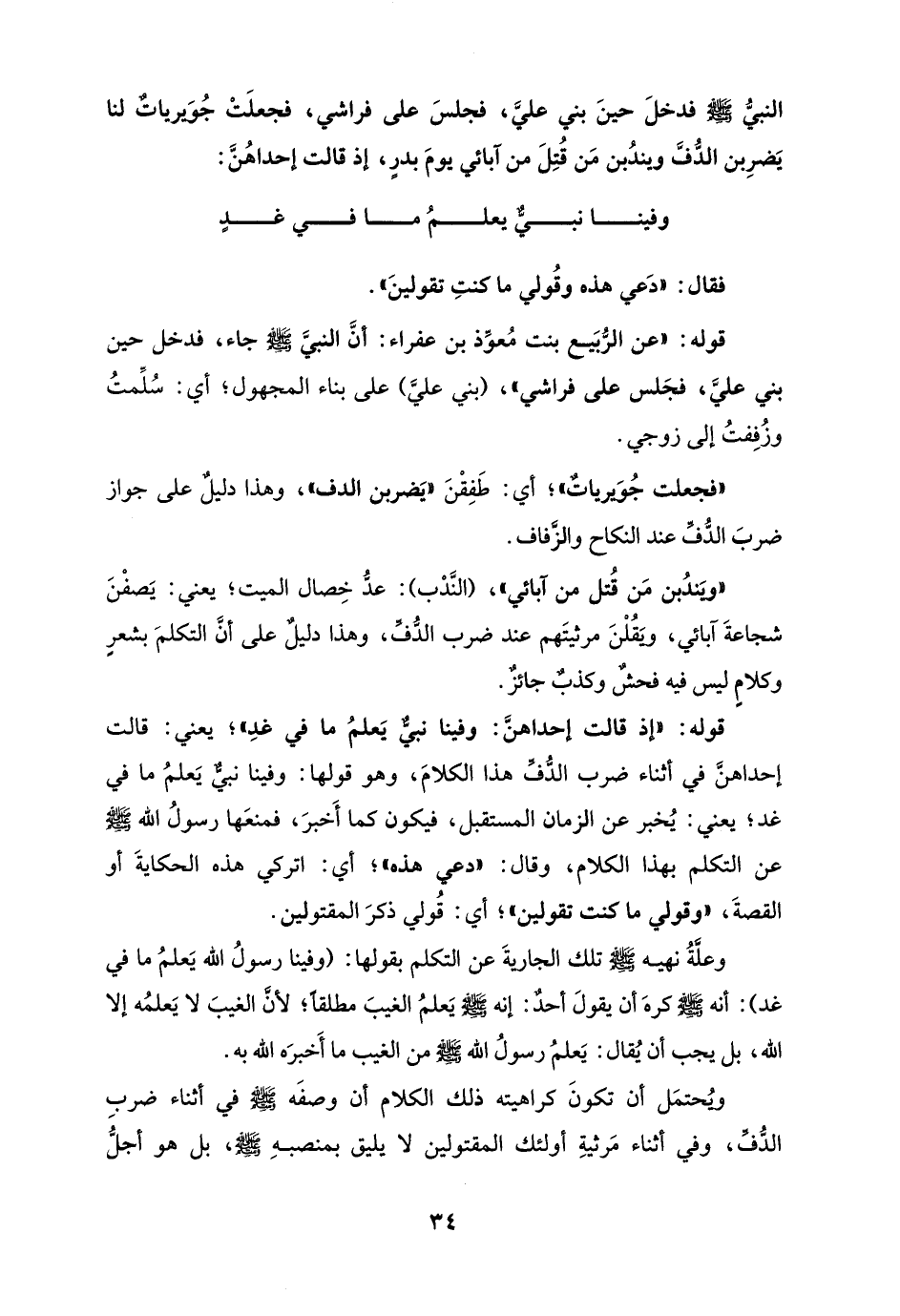ويُحتمَل أن تكونَ كراهيته ذلك الكلام أن وصفَه - صلى الله عليه وسلم - في أثناء ضربِ الدُّفِّ، وفي أثناء مَرثيةِ أولئك المقتولين لا يليق بمنصبهِ - صلى الله عليه وسلم -، بل هو أجلُّ