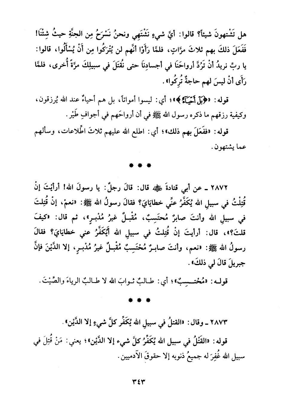هل تَشْتهونَ شيئًا؟ قالوا: أيَّ شيءٍ نَشْتَهِي ونحنُ نَسْرَحُ مِن الجنَّةِ حيثُ شِئْنَا! فَفَعَلَ ذلكَ بهم ثلاثَ مرَّاتٍ، فلمَّا رَأَوْا أنَّهم لن يُتْرَكُوا مِن أَنْ يُسْأَلُوا، قالوا: يا ربِّ نريدُ أنْ تَرُدَّ أرواحَنَا في أجسادِنَا حتى نُقتَلَ في سبيلِكَ مرَّةً أُخرى، فلمَّا رَأَى أنْ ليسَ لهم حاجةٌ تُرِكُوا".