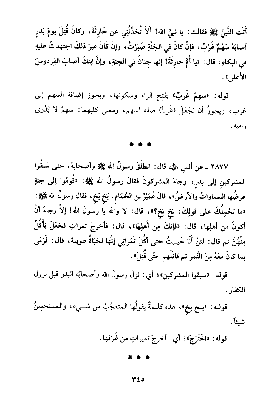 2877 - عن أنسٍ - رضي الله عنه - قال: انطلَقَ رسولُ الله - صلى الله عليه وسلم - وأصحابهُ، حتى سَبقُوا المشركينِ إلى بدرٍ، وجاءَ المشركونَ فقالَ رسولُ الله - صلى الله عليه وسلم -: "قُومُوا إلى جنةٍ عرضُها السماواتُ والأرضُ"، قالَ عُمَيْرُ بن الحُمَامِ: بَخٍ بَخٍ، فقال رسولُ الله - صلى الله عليه وسلم -: "ما يَحْمِلُكَ على قولِكَ: بَخٍ بَخٍ؟ "، قال: لا والله يا رسولَ الله! إلاَّ رجاءَ أنْ أكونَ من أهلِها، قال: "فإنكَ مِن أَهلِهَا"، قال: فأخرجَ تمراتٍ فجَعَلَ يَأْكُلُ مِنْهُنَّ ثم قال: لئنْ أَنَا حَييتُ حتى آكُلَ تَمَراتِي إنَّها لحَيَاةٌ طويلة، قال: فَرَمَى بما كانَ معَهُ مِنَ التَّمر ثم قاتَلَهم حتّى قُتِلَ".