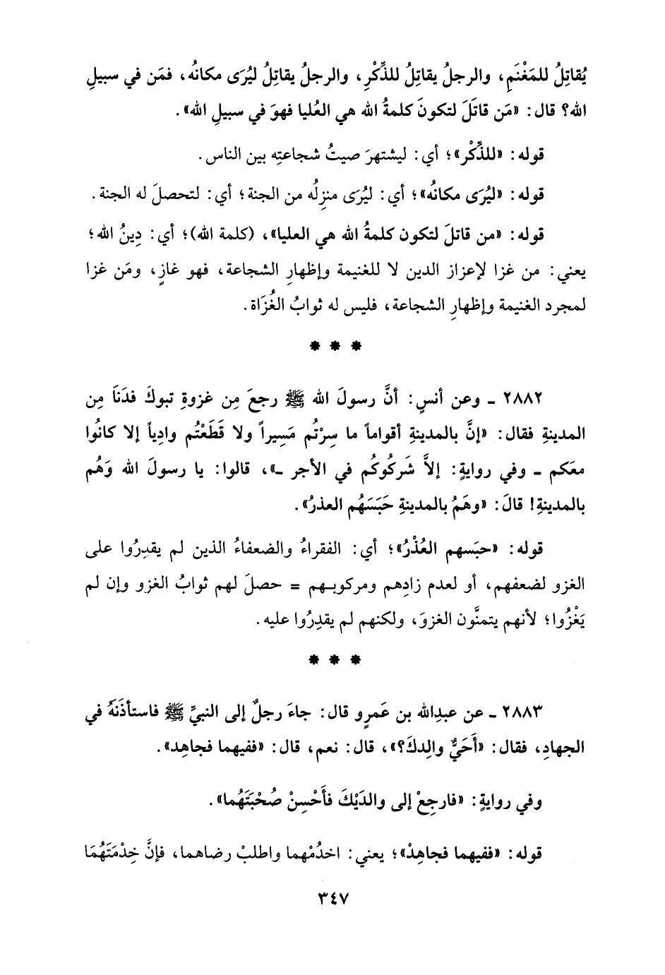 2883 - عن عبدِ الله بن عَمرٍو قال: جاءَ رجلٌ إلى النبيِّ - صلى الله عليه وسلم - فاستأذَنَهُ في الجهادِ، فقال: "أَحَيٌّ والِدكَ؟ "، قال: نعم، قال: "ففيهما فجاهِد".