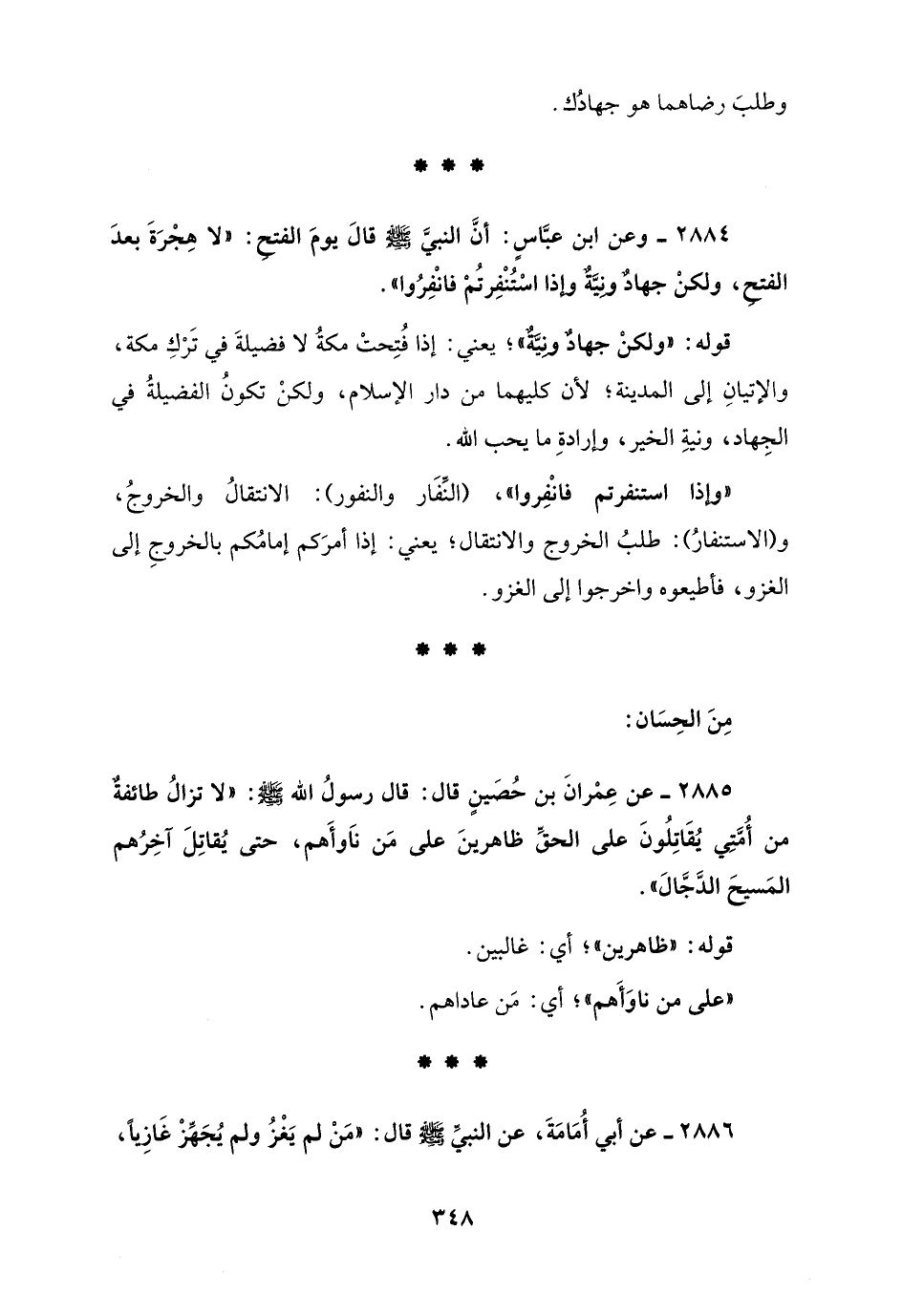 2884 - وعن ابن عبَّاسٍ: أنَّ النبيَّ - صلى الله عليه وسلم - قالَ يومَ الفتحِ: "لا هِجْرَةَ بعدَ الفتحِ، ولكنْ جهادٌ ونِيَّةٌ وإذا اسْتُنْفِرتُمْ فانْفِرُوا".