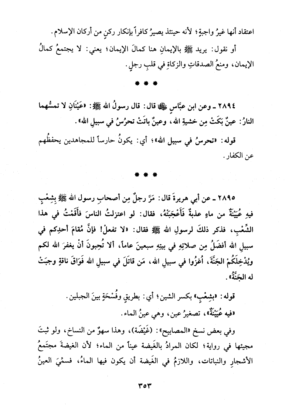 2894 - وعن ابن عبَّاسٍ - رضي الله عنهما - قال: قال رسولُ الله - صلى الله عليه وسلم -: "عَيْنَانِ لا تمسُّهما النارُ: عينٌ بَكَتْ مِن خشيةِ الله، وعينٌ باتَتْ تحرُسُ في سبيلِ الله".