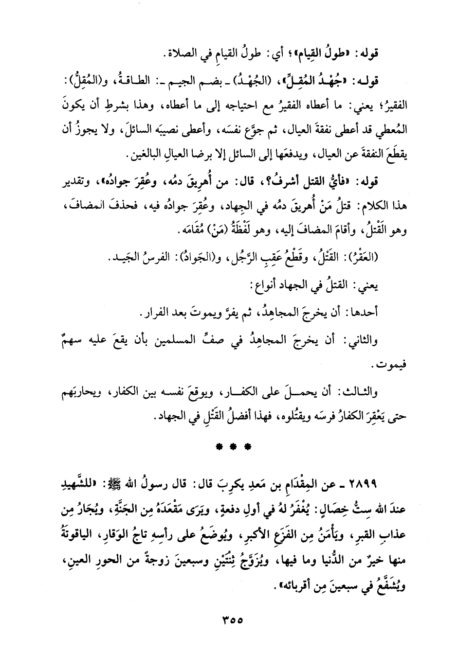 قوله: "فأيُّ القتل أشرفُ؟، قال: من أُهرِيقَ دمُه، وعُقِرَ جوادُه"، وتقدير هذا الكلام: قتلُ مَنْ أُهريقَ دمُه في الجِهاد، وعُقِرَ جوادُه فيه، فحذفَ المضافَ، وهو الَقْتلُ، وأقامَ المضافَ إليه، وهو لَفْظَةُ (مَنْ) مُقَامَه.
