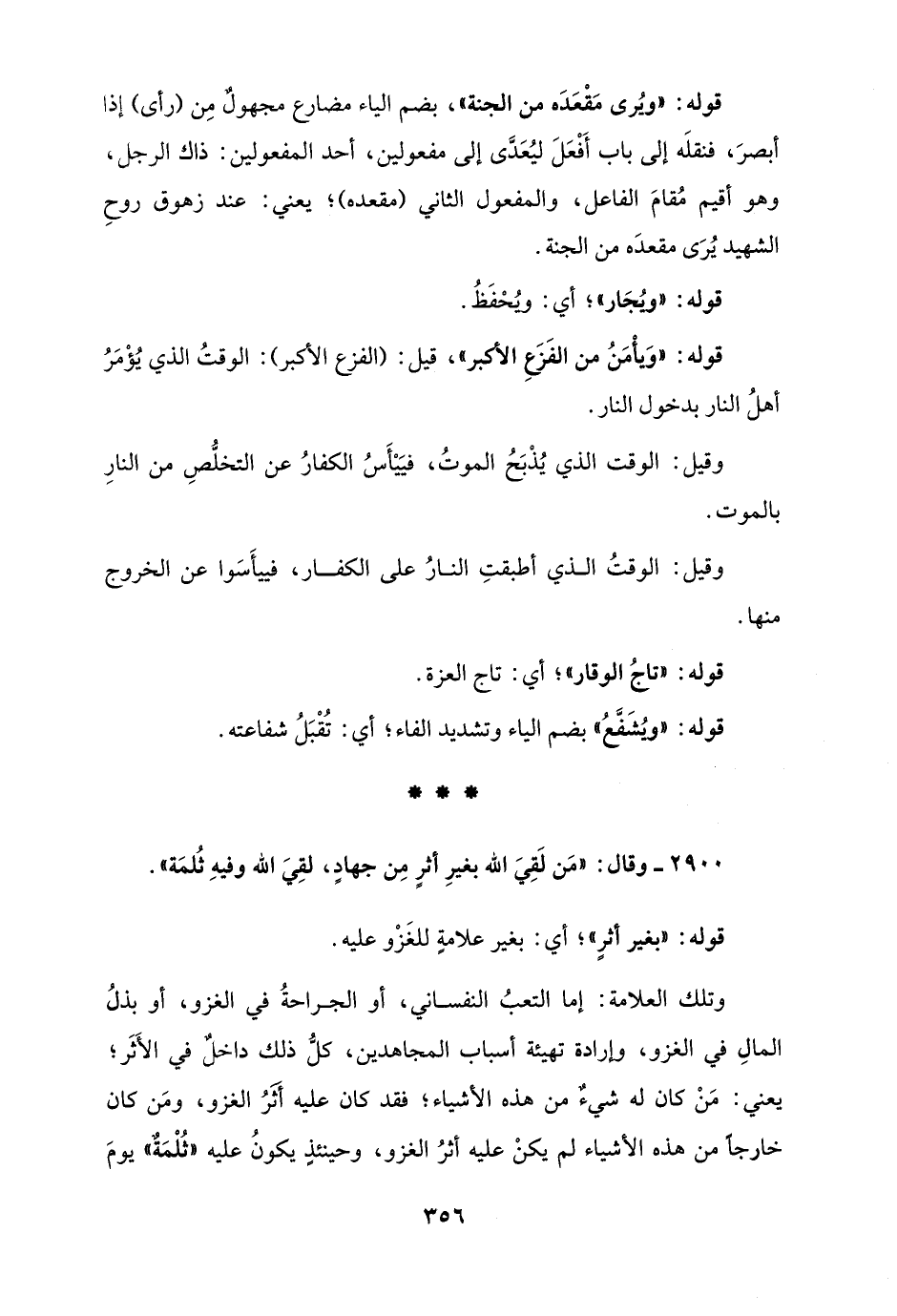 قوله: "ويُرى مَقْعَدَه من الجنة"، بضم الياء مضارع مجهولٌ مِن (رأى) إذا أبصرَ، فنقلَه إلى باب أَفْعَلَ ليُعَدَّى إلى مفعولين، أحد المفعولين: ذاك الرجل، وهو أقيم مُقامَ الفاعل، والمفعول الثاني (مقعده)؛ يعني: عند زهوق روحِ الشهيد يُرَى مقعدَه من الجنة.