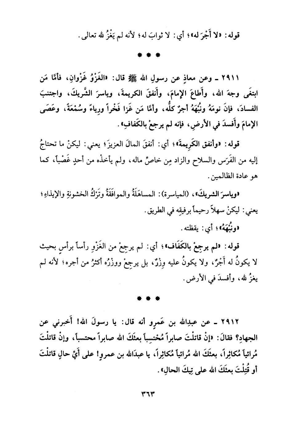 2911 - وعن معاذٍ عن رسولِ الله - صلى الله عليه وسلم - قال: "الغَزْوُ غَزْوانِ، فأمَّا مَن ابتغَى وجهَ الله، وأَطاعَ الإِمامَ، وأَنفقَ الكريمةَ، وياسرَ الشَّريكَ، واجتنبَ الفسادَ، فإنَ نومَهُ ونُبْهَهُ أجرٌ كلُّه، وأمَّا مَن غَزا فَخْرًا ورِياءً وسُمْعَةً، وعَصَى الإمامَ وأَفسدَ في الأرضِ، فإنه لم يرجعْ بالكَفافِ".