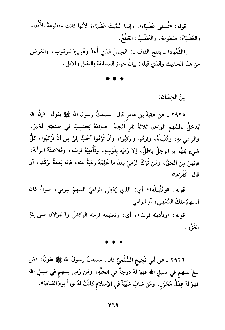 2925 - عن عقبةَ بن عامرٍ قال: سمعتُ رسولَ الله - صلى الله عليه وسلم - يقول: "إنَّ الله يُدخِلُ بالسَّهمِ الواحدِ ثلاثةَ نفرٍ الجنةَ: صانِعَهُ يَحتسِبُ في صنعَتِهِ الخيرَ، والرامي بهِ، ومُنَبلَهُ، وارمُوا واركبُوا، وأنْ تَرْمُوا أَحَبُّ إليَّ مِن أنْ تَرْكبُوا، كلُّ شيءٍ يَلهُو بهِ الرجلُ باطِلٌ، إلا رَميَهُ بِقَوْسِهِ، وتَأْديبَهُ فرسَه، ومُلاعبتَهُ امرأتَهُ، فإنهنَّ مِن الحقِّ، ومَن تَرَكَ الرَّميَ بعدَ ما عَلِمَهُ رغبةً عنه، فإنه نِعمةٌ تَرَكَها، أو قال: كَفَرَها".
