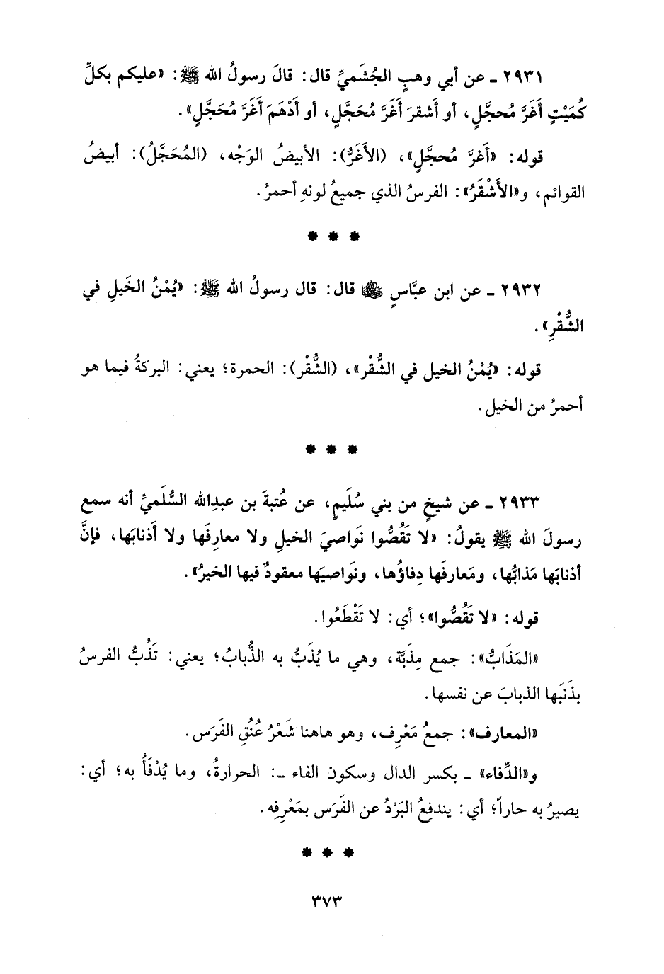 2933 - عن شيخٍ من بني سُلَيمٍ، عن عُتبةَ بن عبدِ الله السُّلَميَّ أنه سمع رسولَ الله - صلى الله عليه وسلم - يقولُ: "لا تَقُصُّوا نَواصيَ الخيلِ ولا معارِفَها ولا أَذنابَها، فإنَّ أذنابَها مَذابُّها، ومَعارفَها دِفاؤُها، ونَواصيَها معقودٌ فيها الخيرُ".