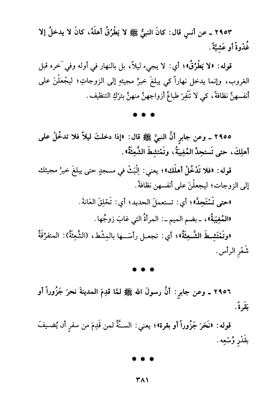 2953 - عن أنسٍ قال: كانَ النبيُّ - صلى الله عليه وسلم - لا يَطْرُقُ أهلَهُ، كانَ لا يدخلُ إلا غُدْوةً أو عَشِيَّةً.