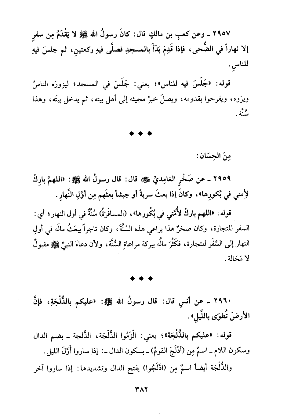 2957 - وعن كعبِ بن مالكٍ قال: كانَ رسولُ الله - صلى الله عليه وسلم - لا يَقْدَمُ مِن سفرٍ إلا نهارًا في الضُّحى، فإذا قَدِمَ بَدَأَ بالمسجدِ فصلَّى فيهِ ركعتينِ، ثم جلسَ فيهِ للناسِ.
