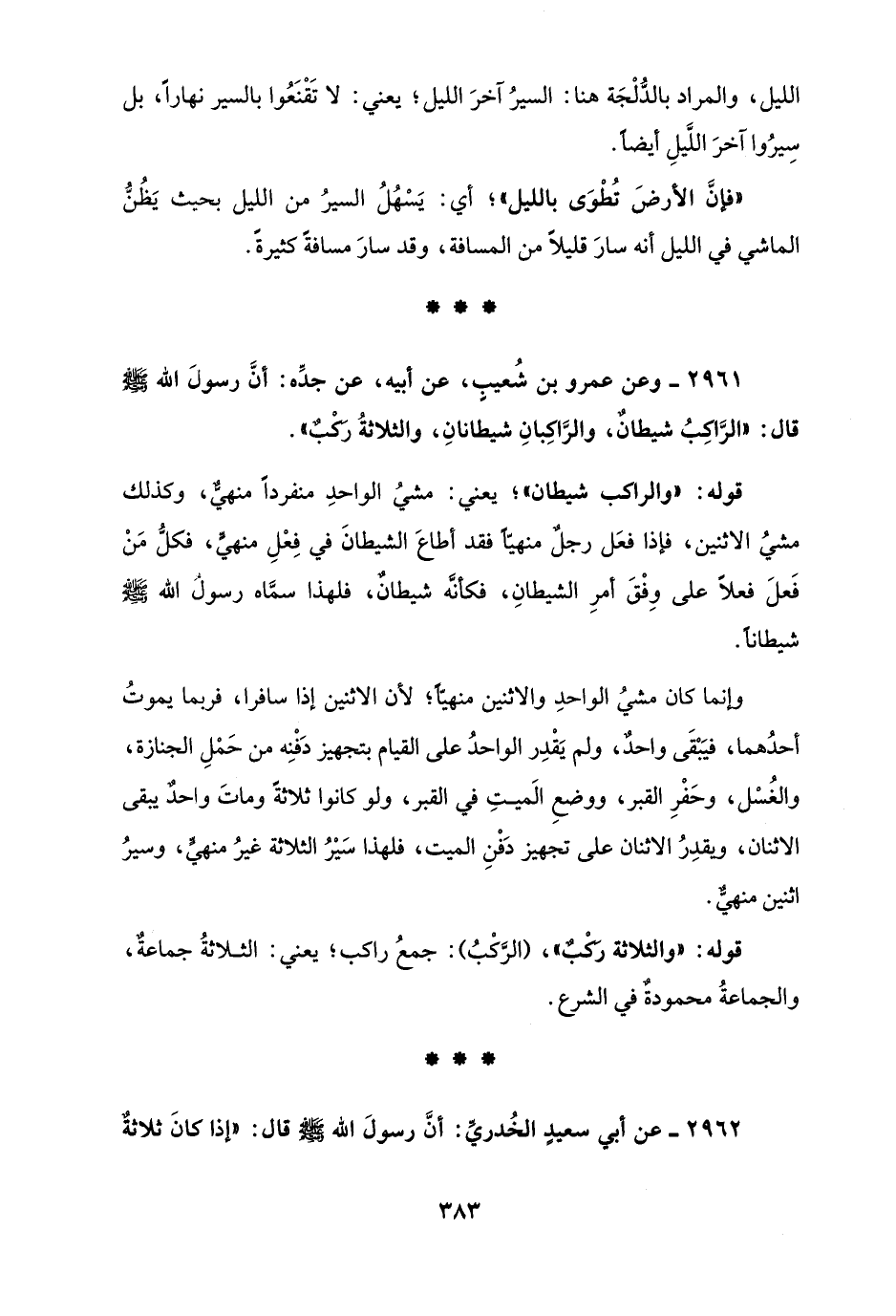 2961 - وعن عمرو بن شُعيبٍ، عن أبيه، عن جدِّه: أنَّ رسولَ الله - صلى الله عليه وسلم - قال: "الرَّاكِبُ شيطانٌ، والرَّاكِبانِ شيطانانِ، والثلاثةُ رَكْبٌ".