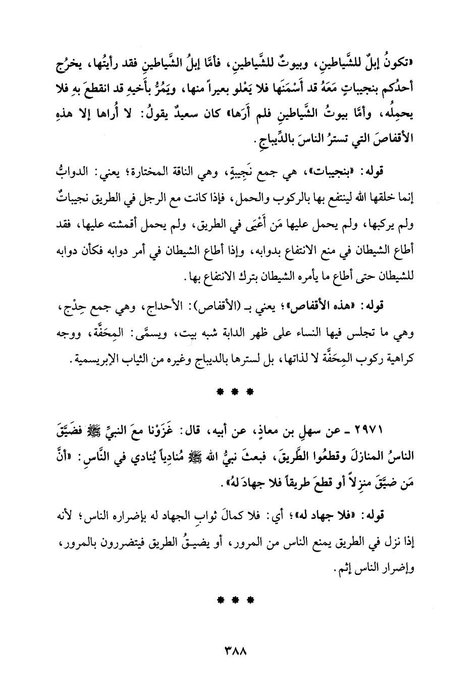 2971 - عن سهلِ بن معاذٍ، عن أبيه، قال: غَزَوْنا معَ النبيِّ - صلى الله عليه وسلم - فضَيَّقَ الناسُ المنازلَ وقطعُوا الطَّريقَ، فبعثَ نبيُّ الله - صلى الله عليه وسلم - مُنادِيًا يُنادي في النَّاسِ: "أنَّ مَن ضيَّقَ منزِلًا أو قطعَ طريقًا فلا جهادَ لهُ".