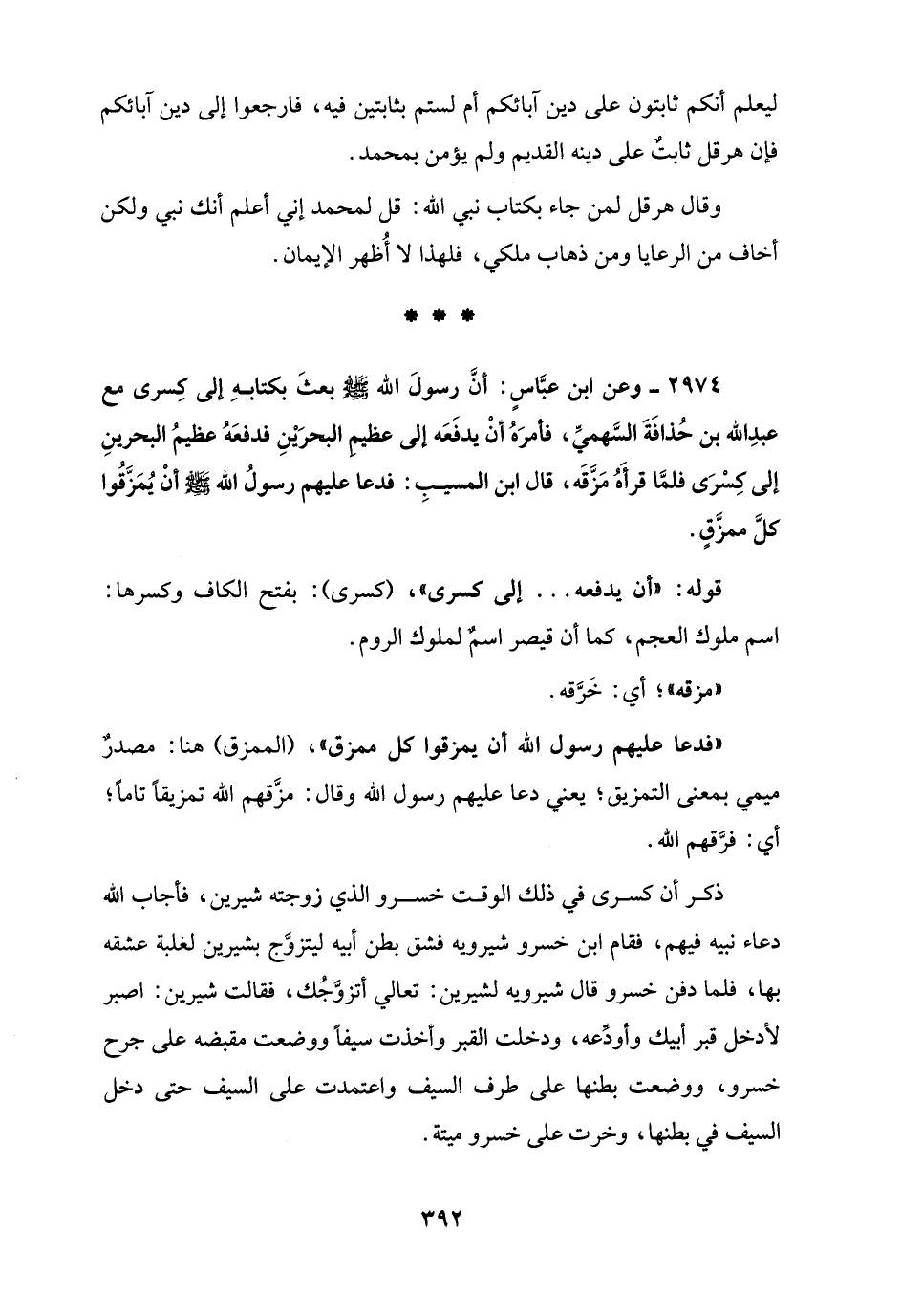2974 - وعن ابن عبَّاسٍ: أنَّ رسولَ الله - صلى الله عليه وسلم - بعثَ بكتابهِ إلى كِسرى مع عبدِ الله بن حُذافَةَ السَّهميِّ، فأمرَهُ أنْ يدفَعَه إلى عظيم البحرَيْنِ فدفعَهُ عظيمُ البحرينِ إلى كِسْرَى فلمَّا قرأَهُ مَزَّقَه، قال ابن المسيبِ: فدعا عليهم رسولُ الله - صلى الله عليه وسلم - أنْ يُمَزَّقُوا كلَّ ممزَّقٍ.