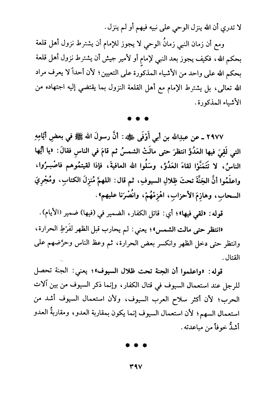 2977 - عن عبدِ الله بن أبي أَوْفَى - رضي الله عنه -: أنَّ رسولَ الله - صلى الله عليه وسلم - في بعضِ أيَّامِهِ التي لَقِيَ فيها العَدُوَّ انتظرَ حتى مالَت الشمسُ ثمَّ قامَ في الناسِ فقالَ: "يا أيُّها الناسُ، لا تتمَنَّوا لقاءَ العَدُوِّ، وسَلُوا الله العافيةَ، فإذا لقيتمُوهم فاصبرُوا، واعلَمُوا أنَّ الجَنَّةَ تحتَ ظِلالِ السيوفِ، ثمَّ قال: اللهمَّ مُنزِلَ الكتابِ، ومُجْرِيَ السحابِ، وهازِمَ الأحزابِ، اهْزِمْهُمْ، وانصرَنا عليهم".
