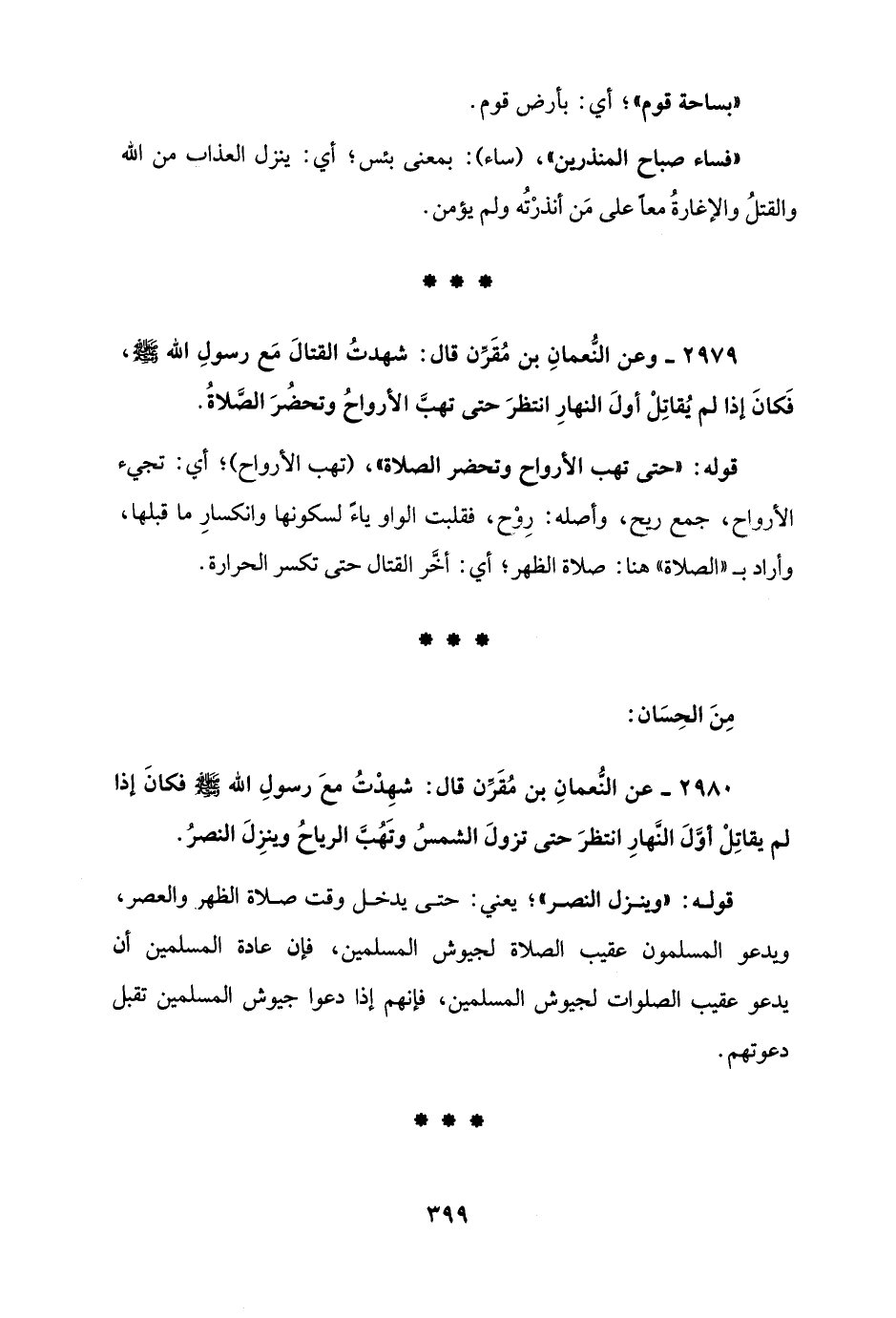 2979 - وعن النُّعمانِ بن مُقَرِّن قال: شهدتُ القتالَ مَع رسولِ الله - صلى الله عليه وسلم -، فَكانَ إذا لم يُقاتِلْ أولَ النهارِ انتظرَ حتى تهبَّ الأرواحُ وتحضُرَ الصَّلاةُ.