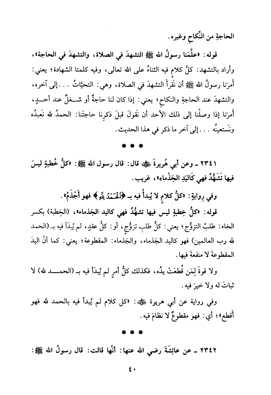 2341 - وعن أبي هُريرةَ - رضي الله عنه - قال: قال رسول الله - صلى الله عليه وسلم -: "كلُّ خُطبةٍ ليسَ فيها تَشَهُّدٌ فهي كَاليَدِ الجَذْماءِ" غريب.