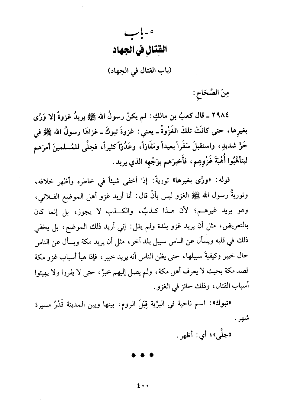 2984 - قال كعبُ بن مالكٍ: لم يكنْ رسولُ الله - صلى الله عليه وسلم - يريدُ غزوةً إلا وَرَّى بغيرِها، حتى كانَتْ تلكَ الغَزْوةُ - يعني: غزوةَ تبوكَ - غزاها رسولُ الله - صلى الله عليه وسلم - في حَرًّ شديدٍ، واستقبلَ سَفَرًا بعيدًا ومَفازًا، وعَدُوًّا كثيرًا، فجلَّى للمُسلمينَ أمرَهم ليتأهَّبُوا أُهْبَةَ غَزْوِهِم، فأَخبرَهم بوَجْهِه الذي يريد.