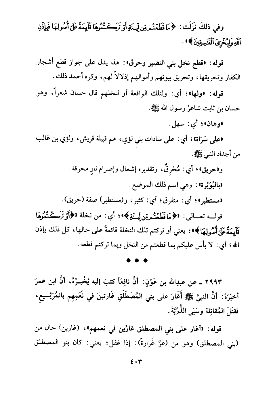 2993 - عن عبدِ الله بن عَوْنٍ: أنَّ نافِعًا كتبَ إليه يُخْبرُهُ، أنَّ ابن عمرَ أخبَرَهُ: أنَّ النبيَّ - صلى الله عليه وسلم - أغارَ على بني المُصطَلَقِ غارتينَ في نَعَمِهِم بالمُرَيْسيعِ، فقتَلَ المُقاتِلة وسَبَى الذُّرِّيَّةَ.