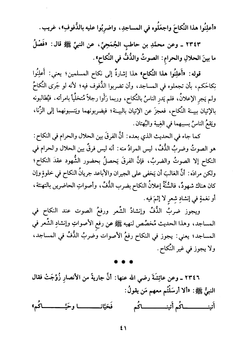 ويجوز ضربُ الدُّف وإنشادُ الشِّعر ورفعُ الصوت عند النكاح في المساجد، وهذا الحديث مُخصَّص لنهيه - صلى الله عليه وسلم - عن رفعِ الأصواتِ وإنشادِ الشِّعر في المساجد؛ يعني: يجوز في النكاح رفعُ الأصوات وضربُ الدُّفَّ في المساجد، ولا يجوز في غير النَّكاح.