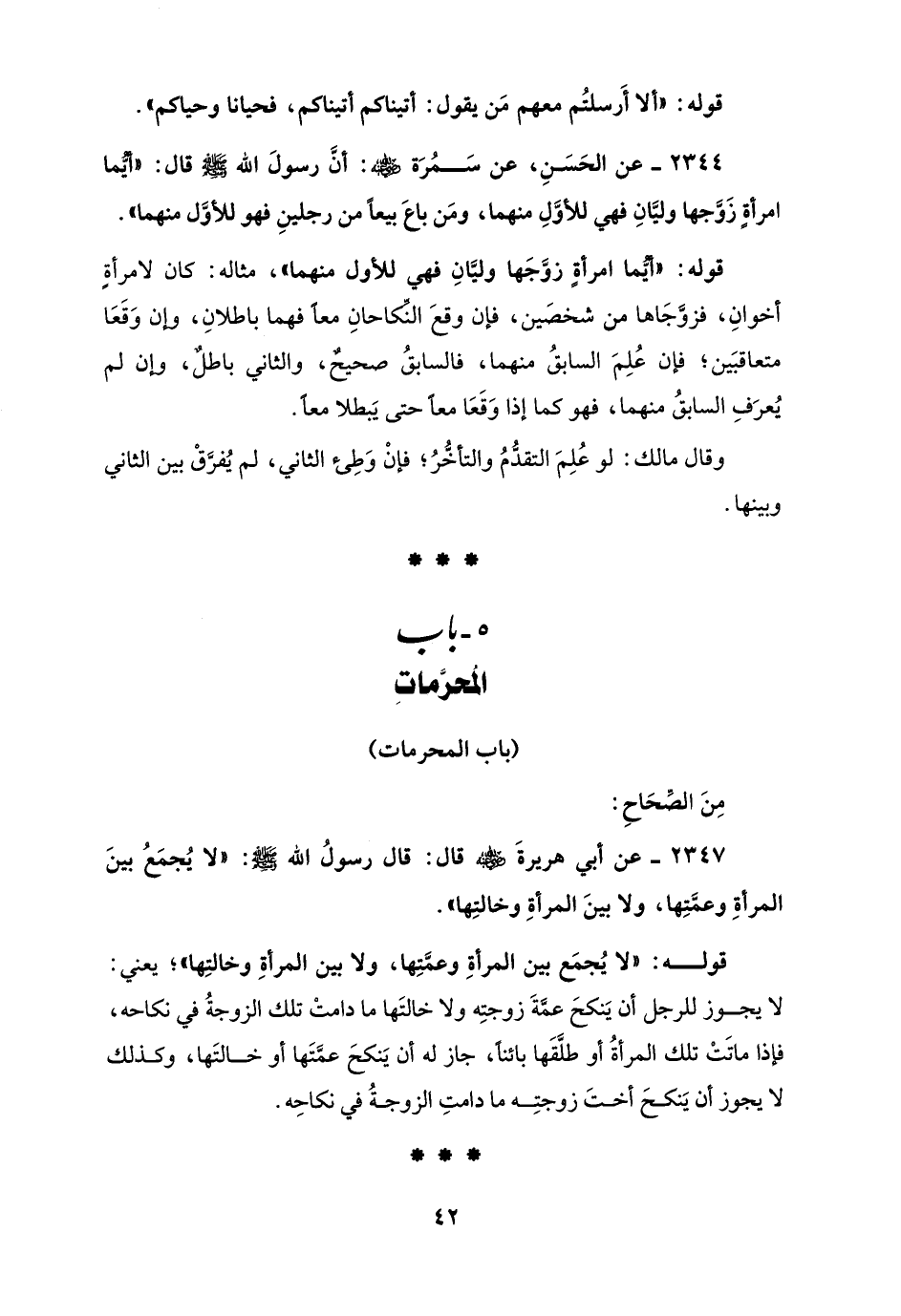 2347 - عن أبي هريرةَ - رضي الله عنه - قال: قال رسولُ الله - صلى الله عليه وسلم -: "لا يُجمَعُ بينَ المرأةِ وعمَّتِها, ولا بينَ المرأةِ وخالتِها".