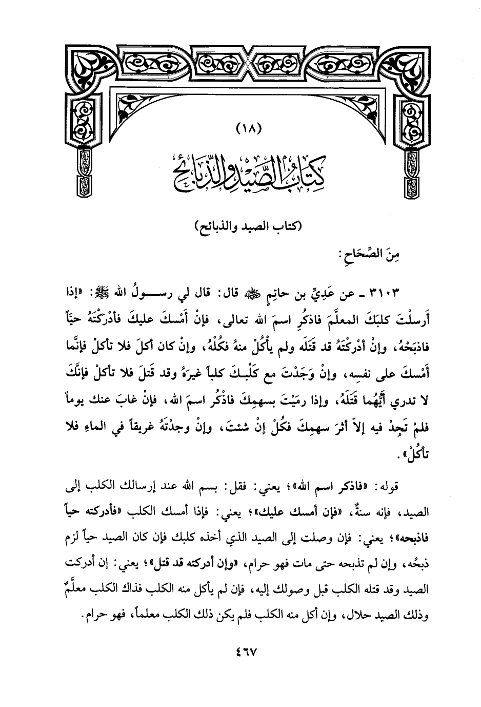 3103 - عن عَدِيِّ بن حاتِمٍ - رضي الله عنه - قال: قال لي رسولُ الله - صلى الله عليه وسلم -: "إذا أَرسلْتَ كلبَكَ المعلَّمَ فاذكُرِ اسمَ الله تعالى، فإنْ أَمْسكَ عليكَ فأدْرَكْتَهُ حيًّا فاذبَحْهُ، وإنْ أدْركْتَهُ قد قَتَلَه ولم يأْكُلْ منهُ فكُلْهُ، وإنْ كان أكلَ فلا تأكلْ فإنَّما أَمْسكَ على نفسِه، وإنْ وَجَدْتَ مع كَلْبكَ كلبًا غيرَهُ وقد قَتلَ فلا تأكلْ فإنَّكَ لا تدري أَيُّهُما قَتَلَهُ، وإذا رمَيْتَ بسهمِكَ فاذْكُر اسمَ الله، فإنْ غابَ عنك يومًا فلمْ تَجِدْ فيه إلاّ أثرَ سهمِكَ فكُلْ إنْ شئتَ، وإنْ وجدْتَهُ غريقًا في الماءِ فلا تأكُلْ".