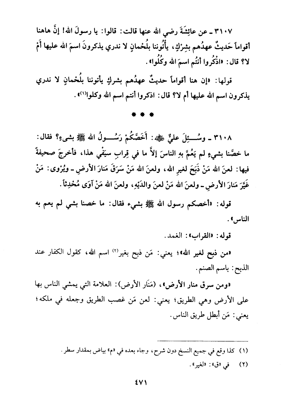 3108 - وسُئِلَ عليٌّ - رضي الله عنه -: أَخَصَّكُمْ رَسُولُ الله - صلى الله عليه وسلم - بشئٍ؟ فقال: ما خصَّنا بشيءٍ لم يَعُمَّ بهِ الناسَ إلَّا ما في قِرابِ سيَفْي هذا، فأخرجَ صحيفةً فيها: لعنَ الله مَنْ ذَبَحَ لغيرِ الله، ولعنَ الله مَنْ سَرَقَ مَنارَ الأرضِ - ويُرْوى: مَنْ غَيَّرَ مَنارَ الأرضِ - ولعنَ الله مَنْ لعنَ والدَيْهِ، ولعنَ الله مَنْ آوَى مُحْدِثًا.