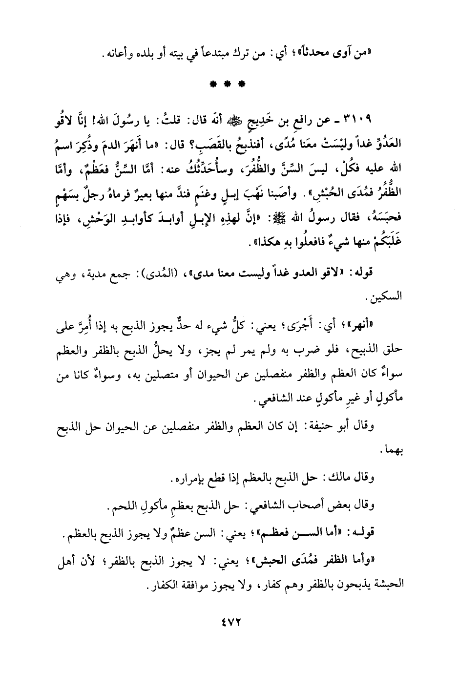 3109 - عن رافعِ بن خَدِيجٍ - رضي الله عنه - أنّه قال: قلتُ: يا رسُولَ الله! إنَّا لاقُو العَدُوِّ غدًا وليْسَتْ معَنا مُدًى، أفنذبحُ بالقَصَبِ؟ قال: "ما أَنهَرَ الدمَ وذُكِرَ اسمُ الله عليه فكُلْ، ليسَ السِّنَّ والظُّفُرَ، وسأُحَدِّثُكُ عنه: أمَّا السِّنُّ فعَظْمٌ، وأمَّا الظُّفُرُ فمُدَى الحُبْشِ". وأصَبنا نَهْبَ إبلٍ وغنَمٍ فندَّ منها بعيرٌ فرماهُ رجلٌ بسَهْمٍ فحبَسَهُ، فقال رسولُ الله - صلى الله عليه وسلم -: "إنَّ لهذِهِ الإِبلِ أوابدَ كأوابدِ الوَحْشِ، فإذا غَلَبَكُمْ منها شيءٌ فافعلُوا بهِ هكذا".