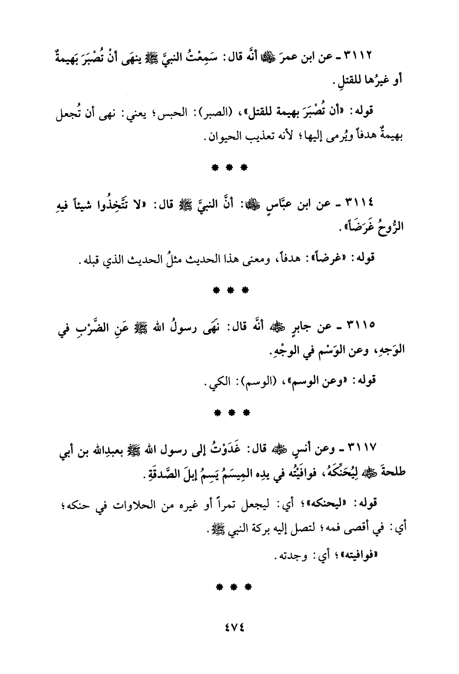 3112 - عن ابن عمرَ - رضي الله عنهما - أنَّه قال: سَمِعْتُ النبيَّ - صلى الله عليه وسلم - ينهَى أنْ تُصْبَرَ بَهيمةٌ أو غيرُها للقتلِ.