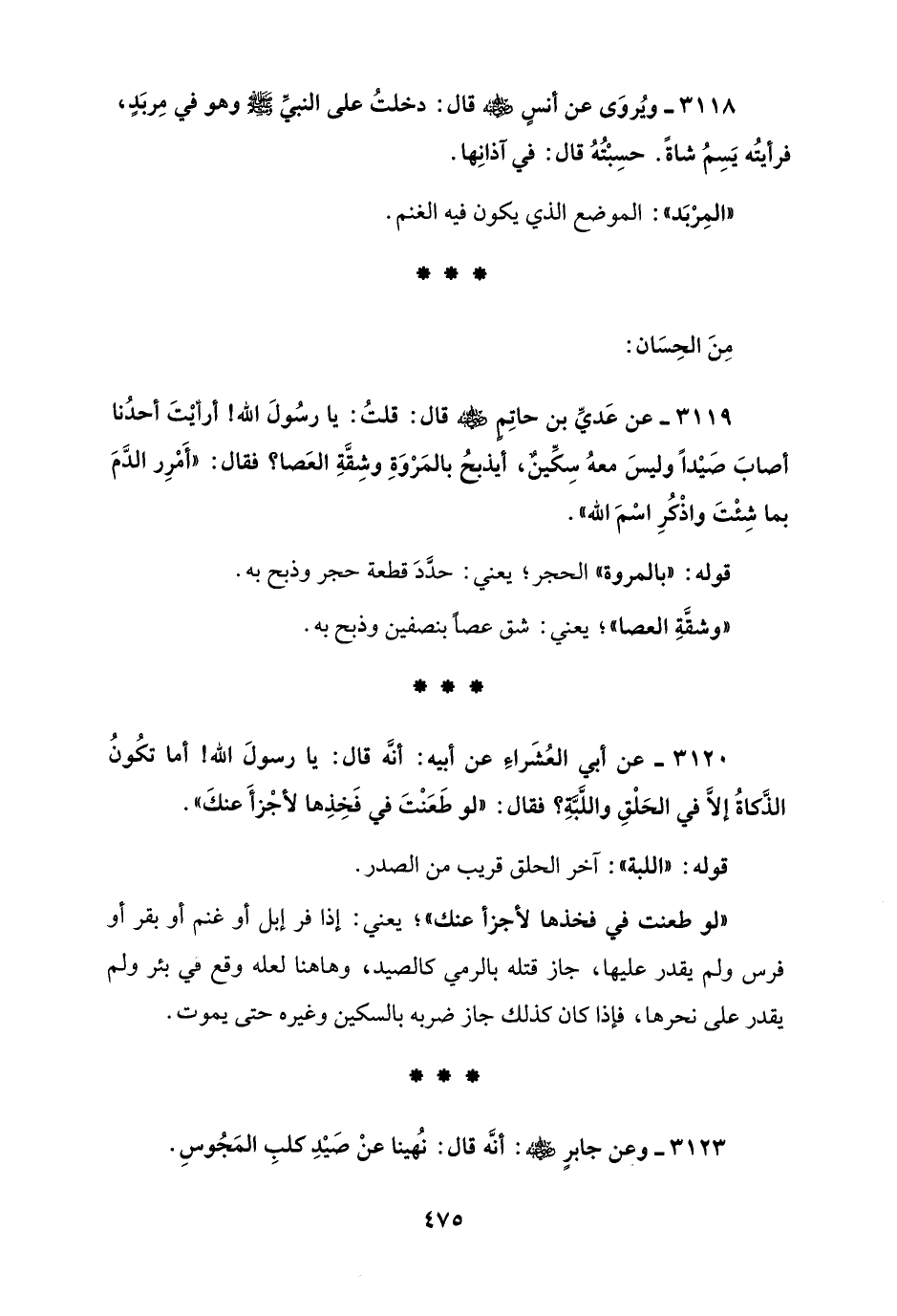 3119 - عن عَديِّ بن حاتِمٍ - رضي الله عنه - قال: قلتُ: يا رسُولَ الله! أرأيْتَ أحدُنا أصابَ صَيْدًا وليسَ معهُ سِكِّينٌ، أيذبحُ بالمَرْوَةِ وشِقَّةِ العَصا؟ فقال: "أَمْرِر الدَّمَ بما شِئْتَ واذْكُرِ اسْمَ الله".