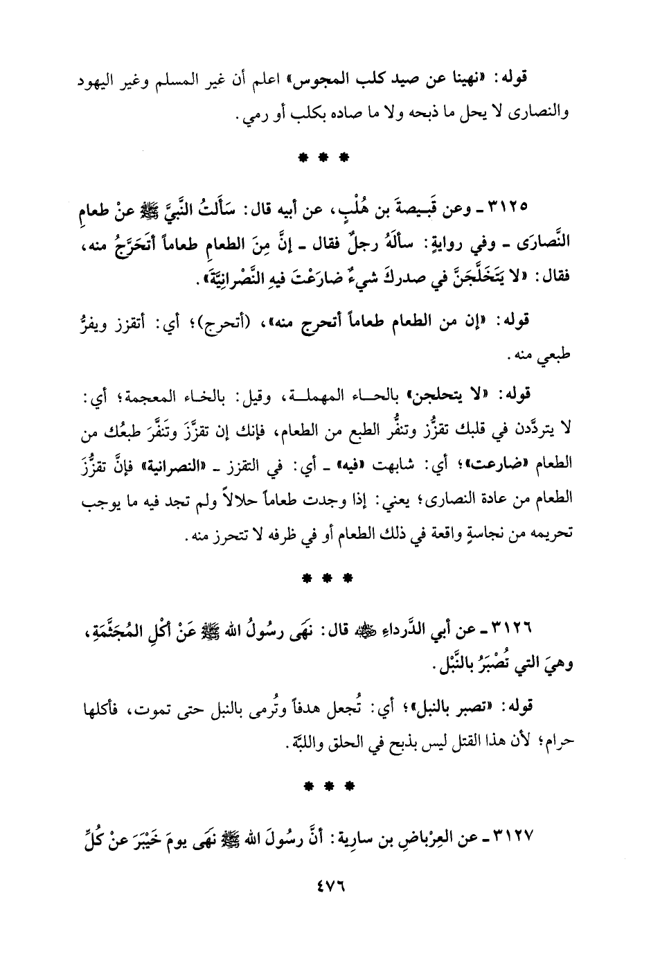 3125 - وعن قَبيصةَ بن هُلْبٍ، عن أبيه قال: سَأَلتُ النَّبيَّ - صلى الله عليه وسلم - عنْ طعامِ النَّصارَى - وفي روايةٍ: سألَهُ رجلٌ فقال - إنَّ مِنَ الطعامِ طعامًا أتَحَرَّجُ منه، فقال: "لا يتَخَلَّجَنَّ في صدركَ شيءٌ ضارَعْتَ فيهِ النَّصْرانِيَّةَ".