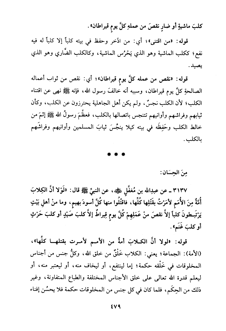 3137 - عن عبدِ الله بن مُغفَّلٍ - رضي الله عنه -، عن النبيِّ - صلى الله عليه وسلم - قال: "لَوْلا أنَّ الكِلابَ أُمَّةٌ مِنَ الأُمَمِ لأمَرْتُ بقَتْلِها كُلِّها، فاقتُلُوا منها كُلَّ أسودَ بهيمٍ، وما منْ أهلِ بَيْتٍ يَرْتَبطونَ كلبًا إلَّا نقصَ منْ عَمَلِهِمْ كُلَّ يومٍ قِيراطٌ إلَّا كلبَ صَيْدٍ أو كلبَ حَرْثٍ أو كلبَ غَنَم".
