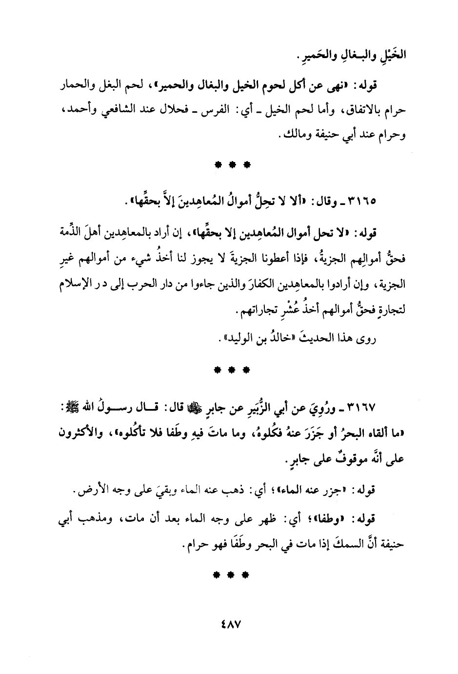 3167 - ورُوِيَ عن أبي الزُّبَيرِ عن جابرٍ - رضي الله عنهما - قال: قال رسولُ الله - صلى الله عليه وسلم -: "ما ألقاه البحرُ أو جَزَرَ عنهُ فكُلوهُ، وما ماتَ فيهِ وطَفا فلا تأكُلوه"، والأكثرون على أنَّه موقوفٌ على جابرٍ.