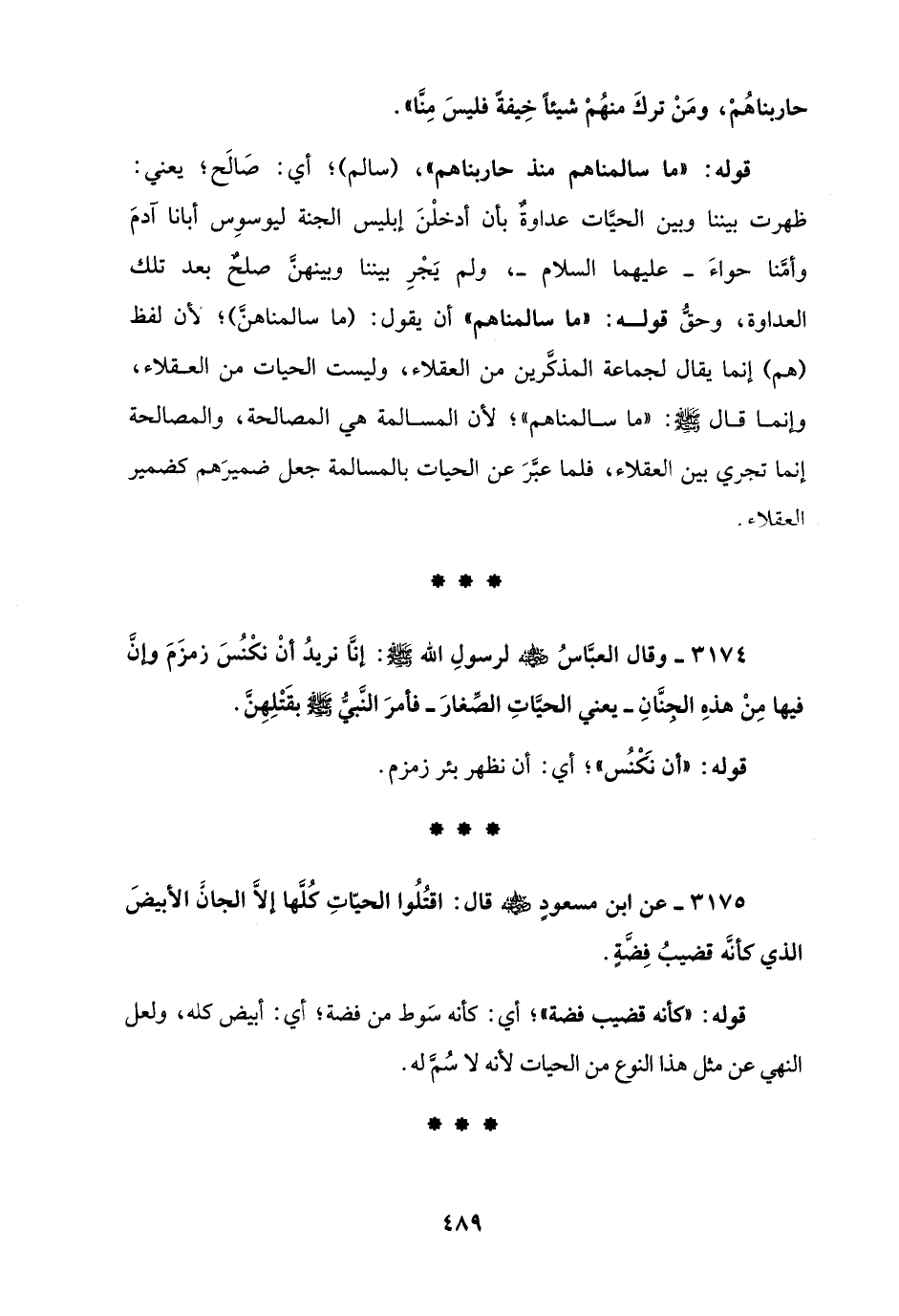 3174 - وقال العبَّاسُ - رضي الله عنه - لرسولِ الله - صلى الله عليه وسلم -: إنَّا نريدُ أنْ نكْنُسَ زمزَمَ وإنَّ فيها مِنْ هذهِ الجِنَّانِ - يعني الحيَّاتِ الصِّغارَ - فأمرَ النَّبيُّ - صلى الله عليه وسلم - بقَتْلِهِنَّ.