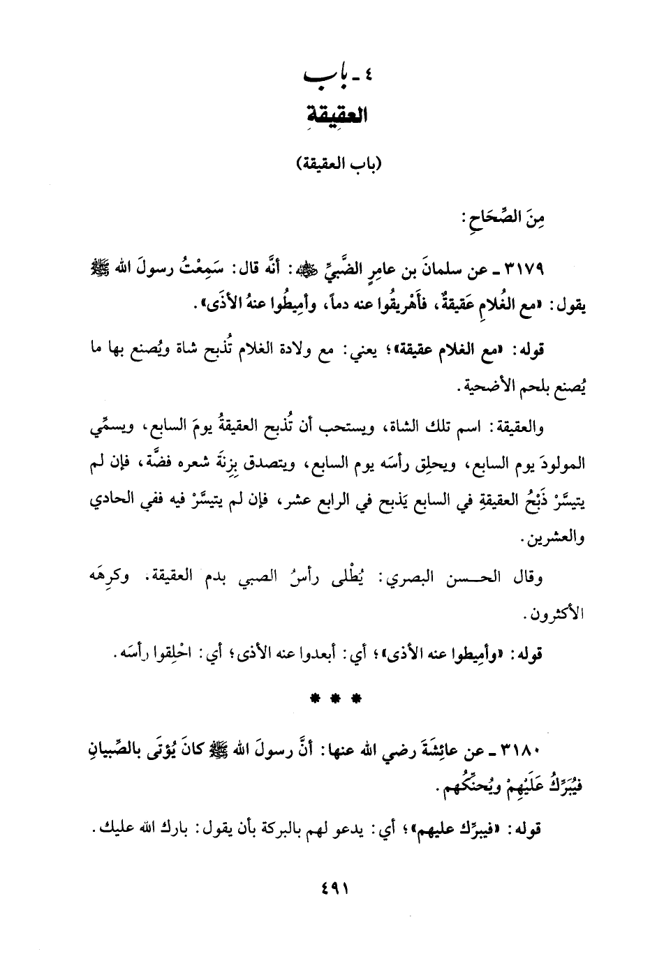 3179 - عن سلمانَ بن عامِرٍ الضَّبيِّ - رضي الله عنه -: أنَّه قال: سَمِعْتُ رسولَ الله - صلى الله عليه وسلم - يقول: "مع الغُلامِ عَقيقةٌ، فأَهْريقُوا عنه دمًا، وأمِيطُوا عنهُ الأذَى".