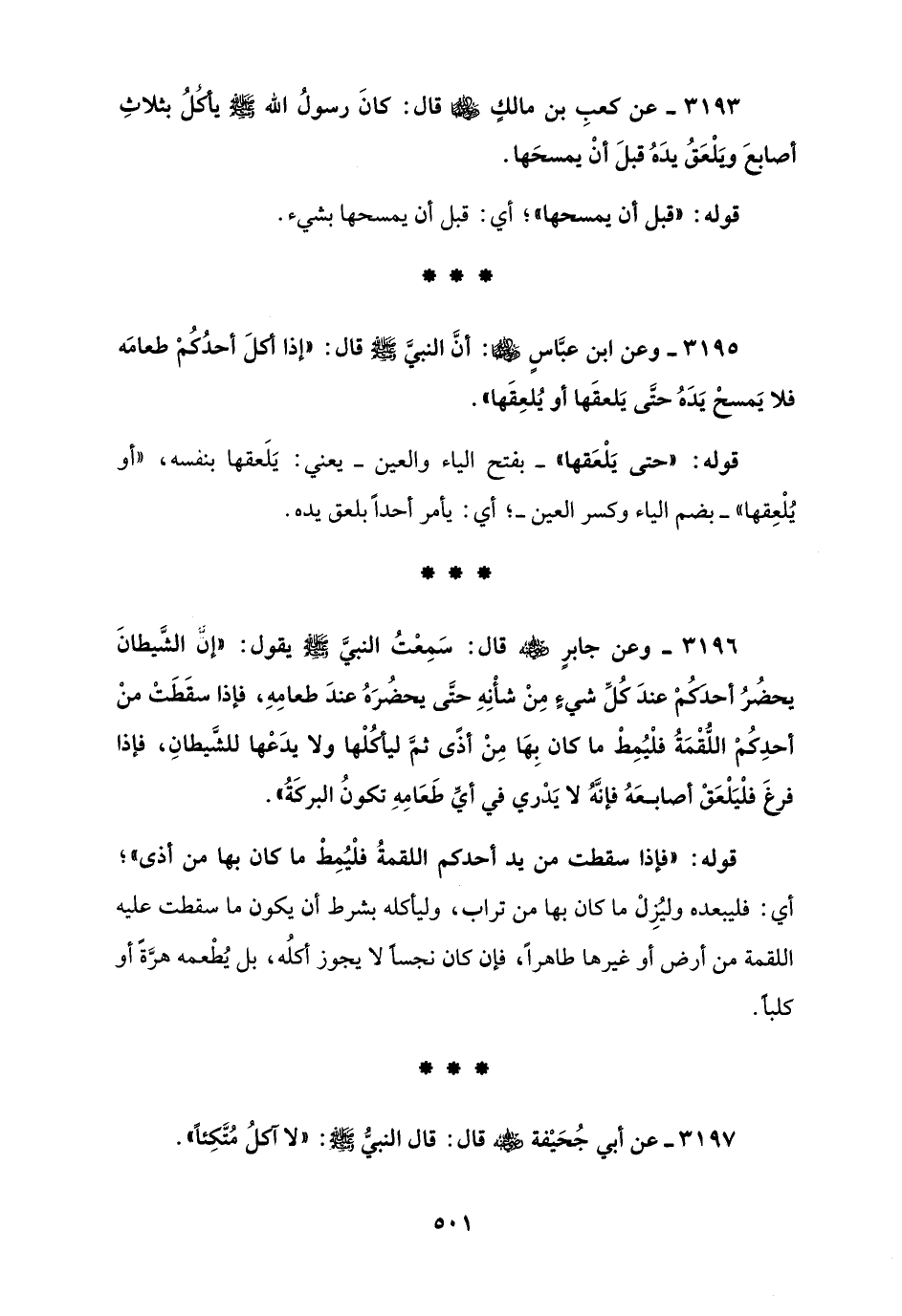 3193 - عن كعبِ بن مالكٍ - رضي الله عنهما - قال: كانَ رسولُ الله - صلى الله عليه وسلم - يأكُلُ بثلاثِ أصابعَ ويَلْعَقُ يدَهُ قبلَ أنْ يمسحَها.