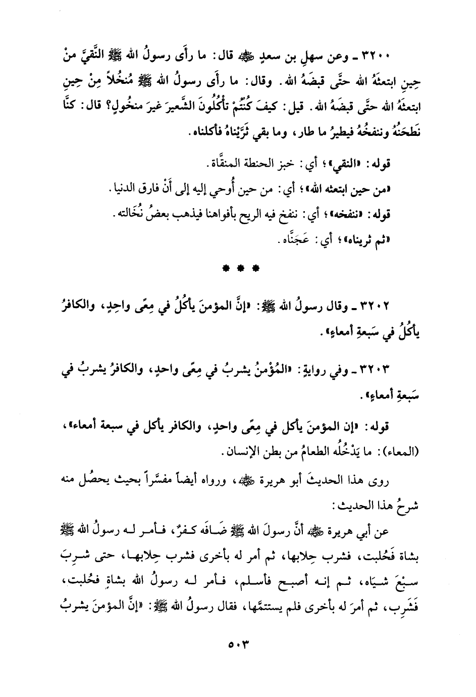 3203 - وفي روايةٍ: "المُؤْمنُ يشربُ في مِعًى واحدٍ، والكافرُ يشربُ في سَبعةِ أمعاءٍ".