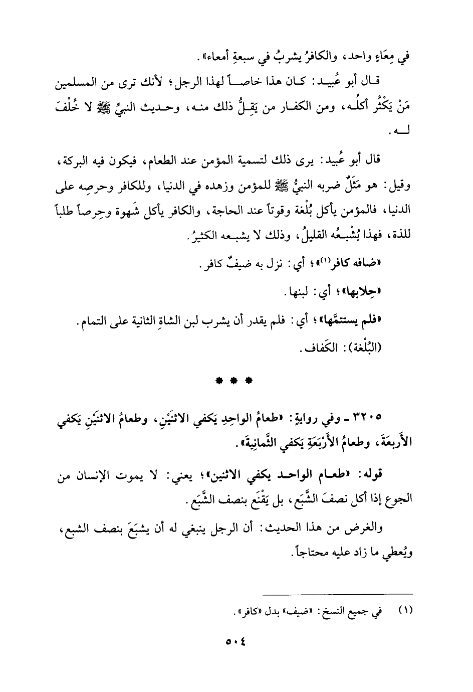قال أبو عُبيدة كان هذا خاصًا لهذا الرجل؛ لأنك ترى من المسلمين مَنْ يَكْثُر أكلُه، ومن الكفار من يَقِلُّ ذلك منه، وحديث النبيِّ - صلى الله عليه وسلم - لا خُلْفَ له.