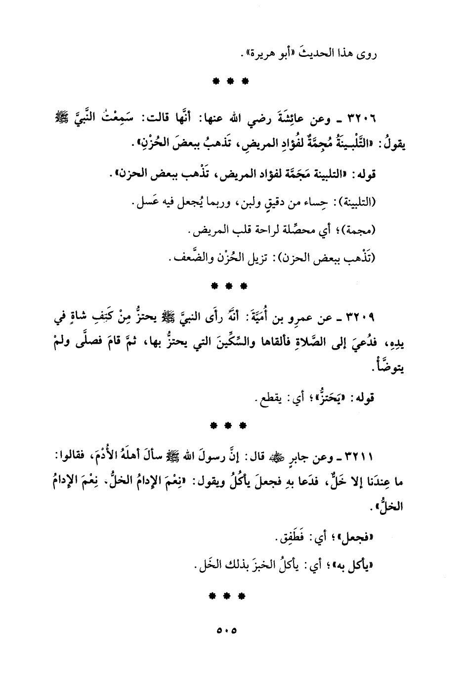 3206 - وعن عائِشَةَ رضي الله عنها: أنَّها قالت: سَمِعْتُ النَّبيَّ - صلى الله عليه وسلم - يقولُ: "التَّلْبينَةُ مُجِمَّةٌ لفُؤادِ المريضِ، تَذهبُ ببعضَ الحُزْنِ".