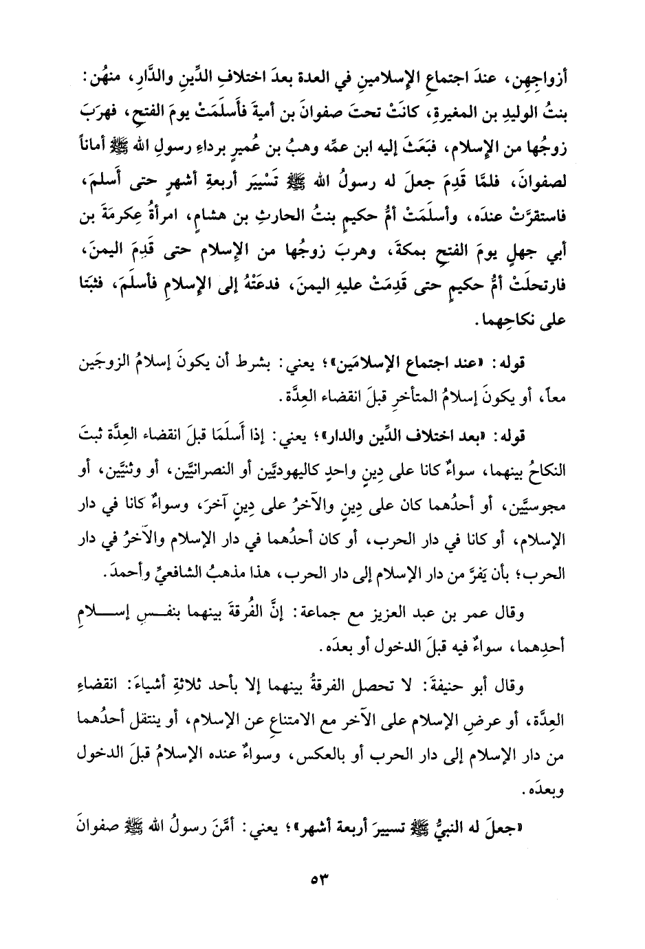 أزواجِهِن، عندَ اجتماعِ الإِسلامينِ في العدة بعدَ اختلافِ الدِّينِ والدَّارِ، منهُن: بنتُ الوليدِ بن المغيرةِ، كانَتْ تحتَ صفوانَ بن أميةَ فأَسلَمَتْ يومَ الفتح، فهرَبَ زوجُها من الإِسلام، فبَعَثَ إليه ابن عمِّه وهبُ بن عُميرٍ برداءِ رسولِ الله - صلى الله عليه وسلم - أمانًا لصفوانَ، فلمَّا قَدِمَ جعلَ له رسولُ الله - صلى الله عليه وسلم - تَسْييَر أربعةِ أشهرٍ حتى أَسلمَ، فاستقرَّتْ عندَه، وأسلَمَتْ أمُّ حكيمٍ بنتُ الحارثِ بن هشامٍ، امرأةُ عِكرمَةَ بن أبي جهلٍ يومَ الفتحِ بمكةَ، وهربَ زوجُها من الإِسلام حتى قَدمَ اليمنَ، فارتحلَتْ أمُّ حكيم حتى قَدِمَتْ عليهِ اليمنَ، فدعَتْهُ إلى الإِسلامِ فأسلَمَ، فثبَتا على نكاحِهما.