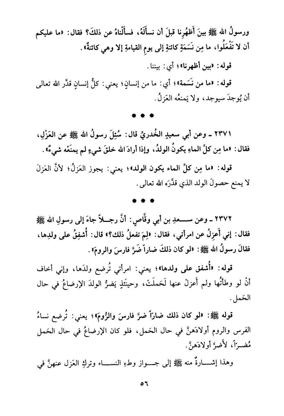 2372 - وعن سعدِ بن أبي وقَّاصٍ: أنَّ رجلًا جاءَ إلى رسولِ الله - صلى الله عليه وسلم - فقال: إني أَعزِلُ عن امرأتي، فقال: "لِمَ تفعلُ ذلك؟ " قال: أُشفِقُ على ولدِها، فقالَ رسولُ الله - صلى الله عليه وسلم -: "لو كان ذلكَ ضارًا ضَرَّ فارسَ والرومَ".