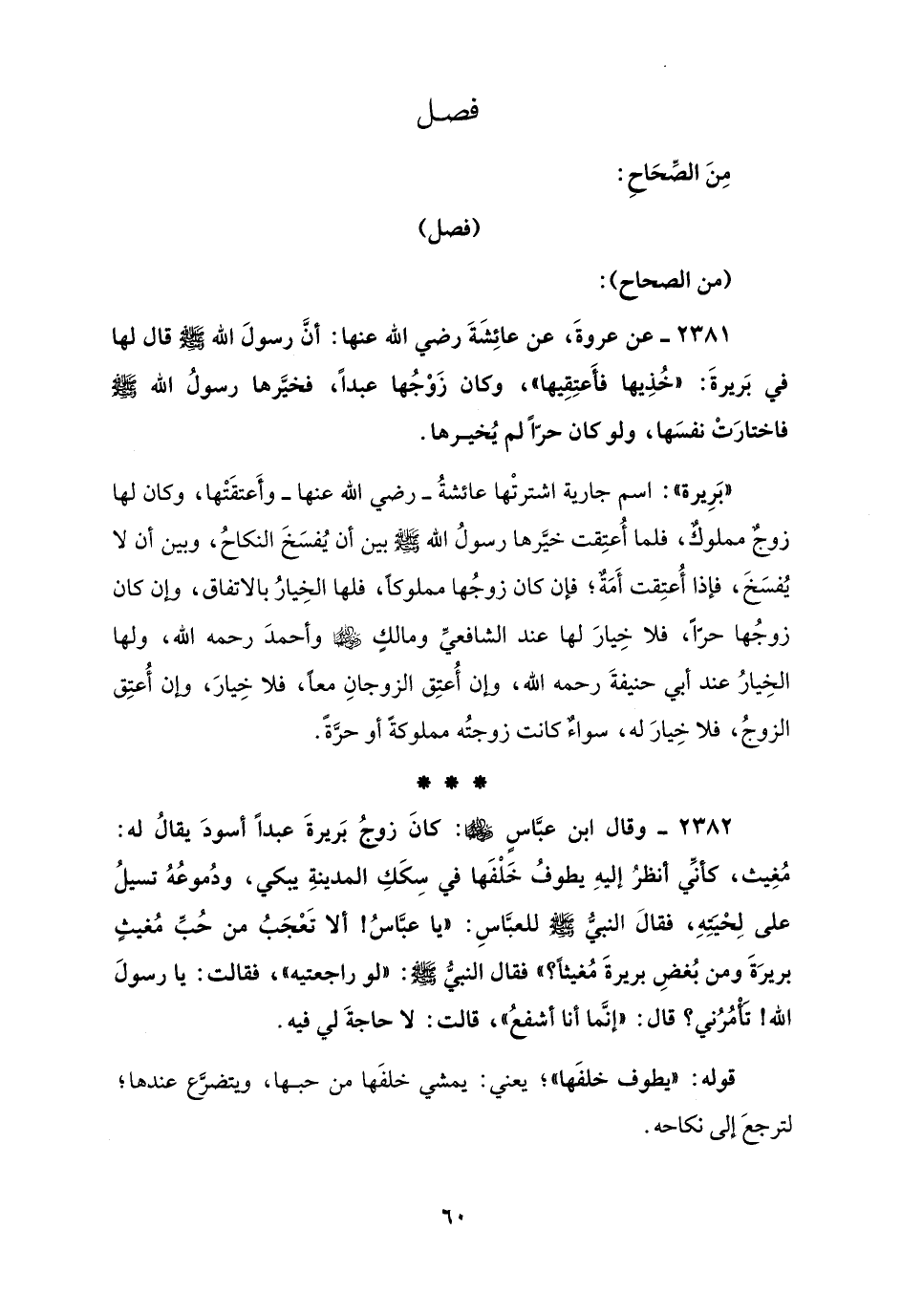 2382 - وقال ابن عبَّاسٍ - رضي الله عنهما -: كانَ زوجُ بَريرةَ عبدًا أسودَ يقالُ له: مُغِيث، كأنَّي أنظرُ إليهِ يطوفُ خَلْفَها في سِكَكِ المدينةِ يبكي، ودُموعُهُ تسيلُ على لِحْيَتِهِ، فقالَ النبيُّ - صلى الله عليه وسلم - للعباسِ: "يا عبَّاسُ! ألا تَعْجَبُ من حُبِّ مُغيثٍ بريرَةَ ومن بُغض بريرةَ مُغيثًا؟ " فقال النبيُّ - صلى الله عليه وسلم -: "لو راجعتيه"، فقالت: يا رسولَ الله! تَأْمُرُني؟ قال: "إنَّما أنا أشفعُ"، قالت: لا حاجةَ لي فيه.