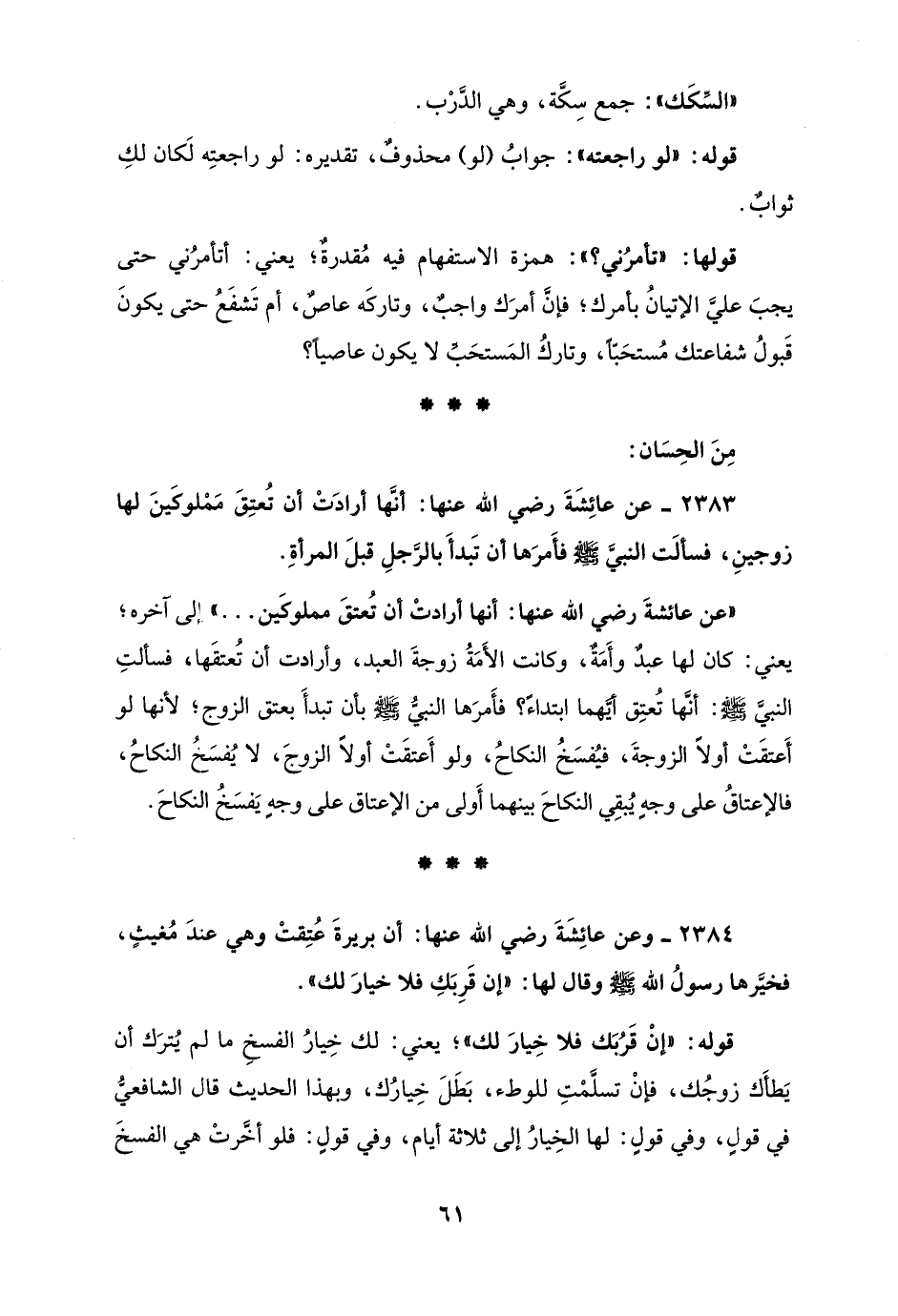 2383 - عن عائِشَةَ رضي الله عنها: أنَّها أرادَتْ أن تُعتِقَ مَمْلوكَينَ لها زوجينِ، فسألَت النبيَّ - صلى الله عليه وسلم - فأَمرَها أن تَبدأَ بالرَّجلِ قبلَ المرأةِ.