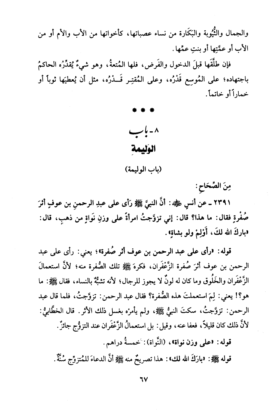 2391 - عن أنسٍ - رضي الله عنه -: أنَّ النبيَّ - صلى الله عليه وسلم - رَأى على عبدِ الرحمنِ بن عوفٍ أثرَ صُفْرةٍ فقال: ما هذا؟ قال: إني تزوَّجتُ امرأةً على وزنِ نَواةٍ من ذهبٍ، قال: "باركَ الله لكَ، أَوْلِمْ ولو بشاةٍ".