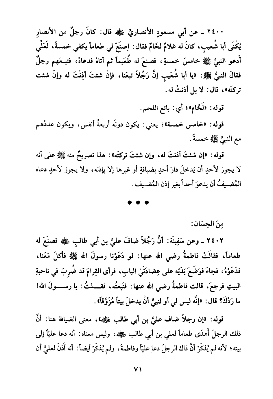 2400 - عن أبي مسعودٍ الأنصاريِّ - رضي الله عنه - قال: كانَ رجلٌ من الأنصارِ يُكْنَى أبا شُعيبٍ، كانَ له غلامٌ لحَّامٌ فقال: اِصنَعْ لي طعامًا يكفي خمسةً، لَعَلِّي أَدعو النبيَّ - صلى الله عليه وسلم - خامسَ خمسةٍ، فصنعَ له طُعَيمًا ثم أتاهُ فدعاهُ، فتبعَهم رجلٌ فقالَ النبيُّ - صلى الله عليه وسلم -: "يا أبا شُعَيبٍ إنَّ رَجُلًا تبعَنا، فإنْ شئتَ أذِنْتَ له وإنْ شئت تركتَه" قال: لا بل أذنتُ له.